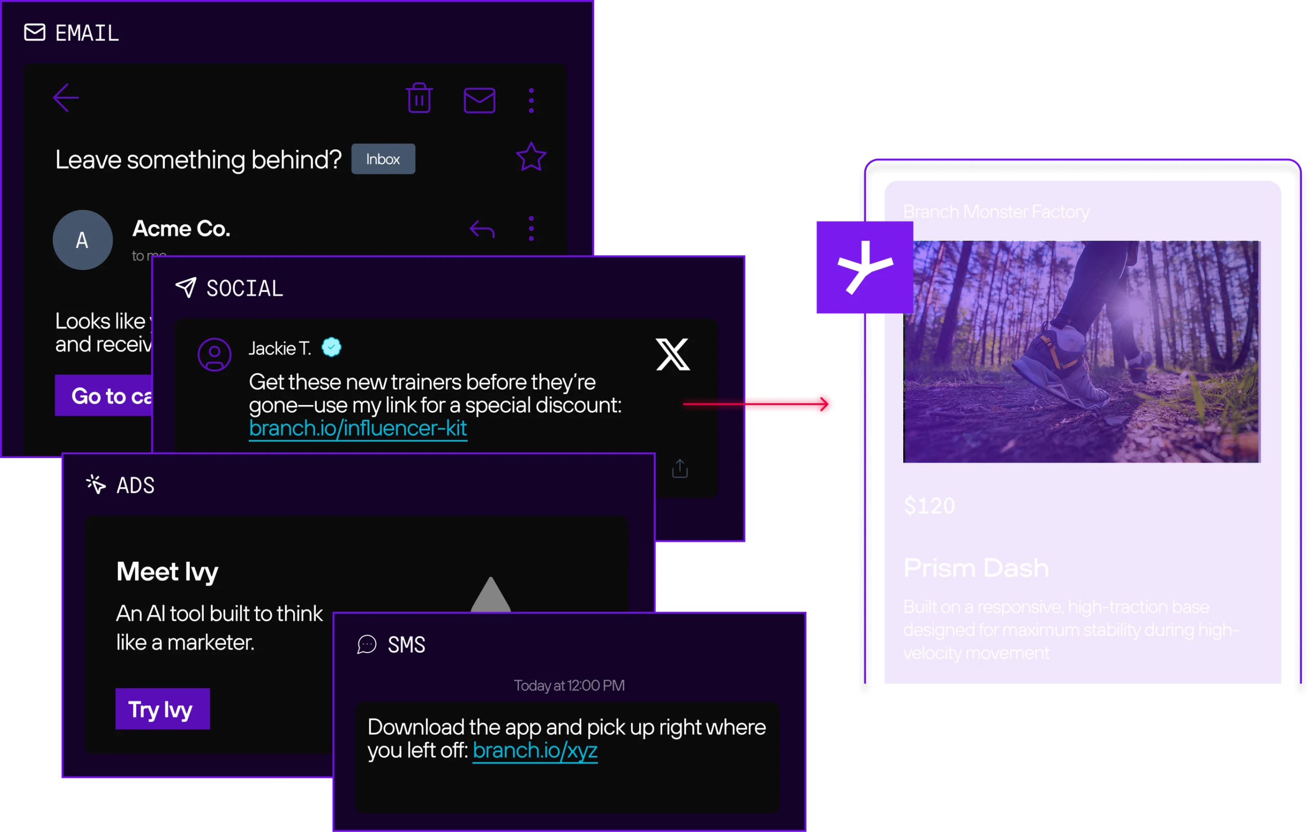 Branch uses deferred deep linking to preserve context through install. The user is sent to the appropriate app store to download the app, and upon opening it for the first time, automatically taken to the specific content they were viewing on the web.