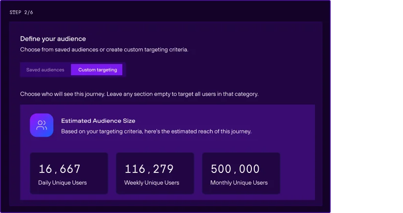 Show different messages based on device, location, behavior, purchase history, app install status, and referring source. This isn’t just audience building — it’s delivering the right message to the right user at the right moment.