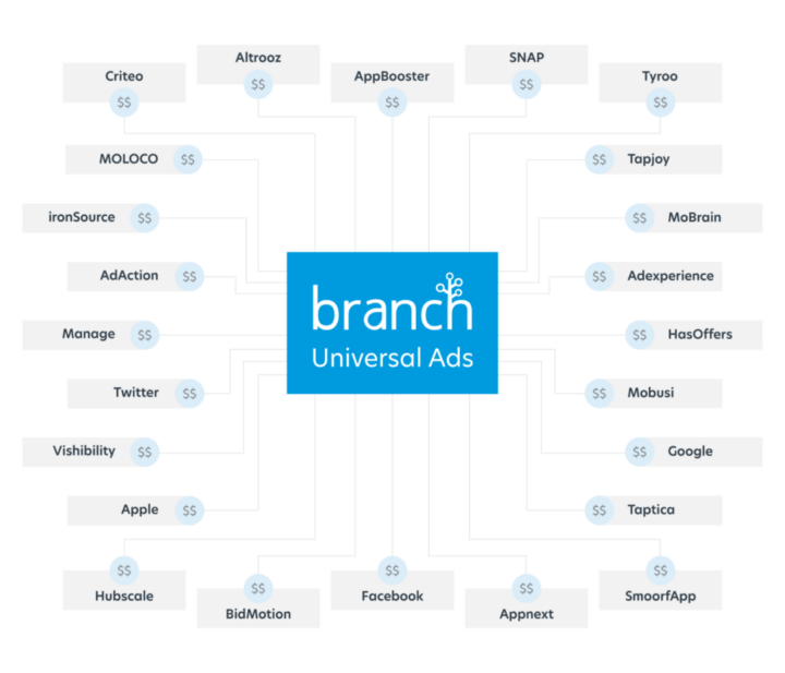 Branch works with every major ad network and media partner, from Google and Facebook to niche publishers. Use our pre-configured integrations to easily aggregate cost data.