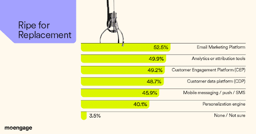 The story marketers are telling isn’t about budget cuts: Only 23.96% of respondents are reducing spend. Instead, there’s a massive replacement wave happening: 52.53% of B2C marketers plan to swap out their email platforms in the next 18 months, with attribution tools close behind at 49.92%.