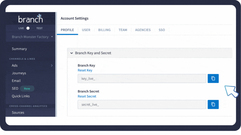 Or, you can go to your Branch Dashboard profile page and copy your Branch Key.