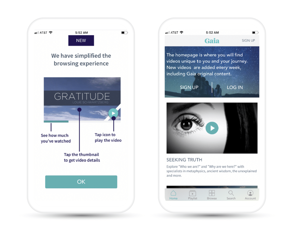 Example: In the screens below, Gaia makes it easy for users to preview what it will be like to get their app up and running by inserting tooltips into the experience, calling out where users can find important features and functionality.