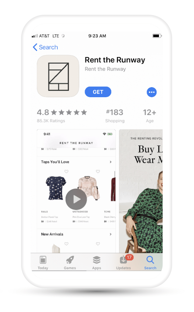 Example: Rent the Runway uses its App Store preview as a form of pre-boarding that provides a welcoming brand moment and helps users evaluate whether or not an app might be for them. Here, users are offered an opportunity to press play and learn more.