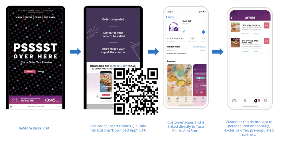 In this example, you can see how Taco Bell could incorporate a QR code into their existing kiosk experience to create a seamless kiosk-to-app experience. This not only provides a new avenue for app growth, but also an opportunity to connect user touchpoints to create a more personalized experience.