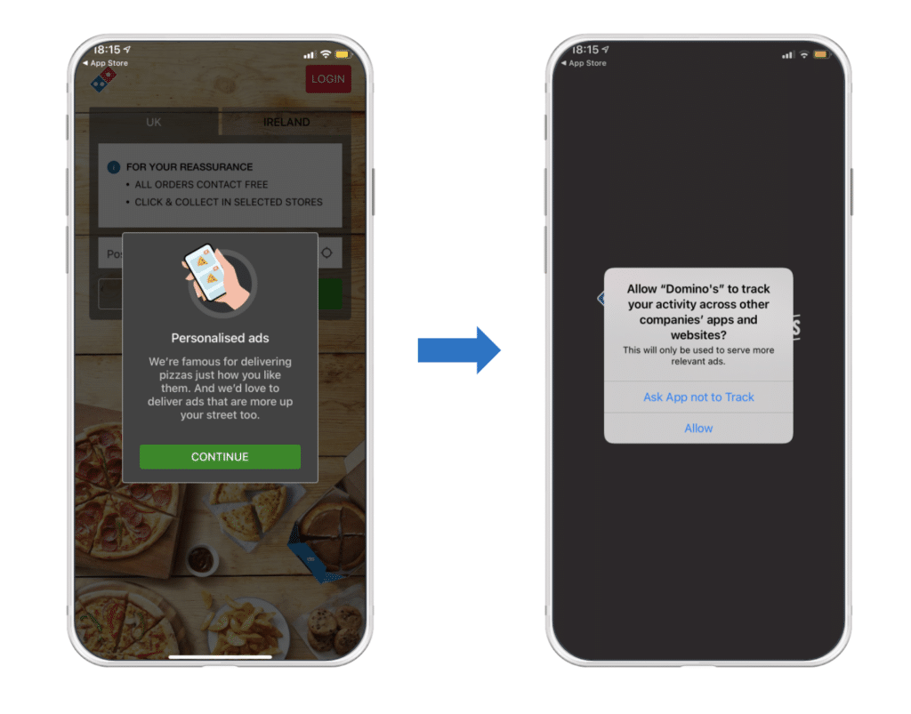 Domino’s UK presents a modal to users that gives additional context to the subsequent Apple prompt. In their contextual modal, Domino’s explains the value of personalized ads, giving additional context to Apple’s prompt. Note how they use ‘continue’ in the call to action button to bring users to the next screen.