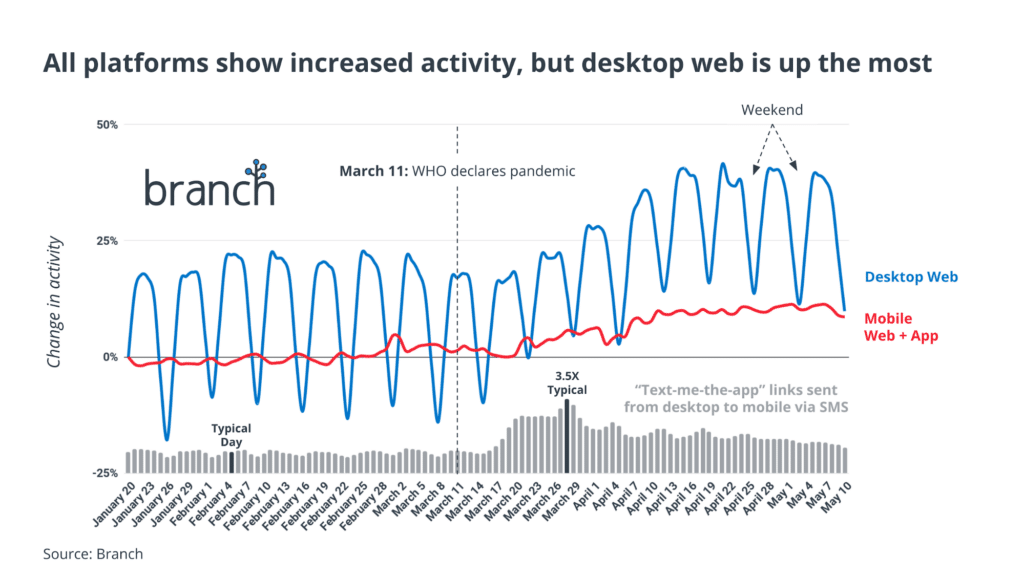 As we looked at trends, one thing is certain: both desktop and mobile usage have increased greatly during the pandemic (though desktop activity has grown the most with spikes during the weekdays), and the balance between desktop and mobile is not equal throughout the week. I even noticed that I use my computer more to research things, shop, or consume entertainment during the week, but by the weekend I am on my phone even to do any work I might have.