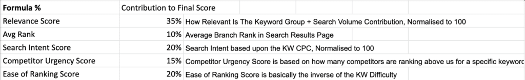 - Come up with keyword rankings based on a formula that takes into consideration how relevant a keyword is to your brand, the ease of ranking for it in search results (based on the keyword difficulty rating you can get from tools like Moz or SEMRush), keyword search volume, and search intent score (based on conversion rates from cost per click bidding scores — the higher the CPC, the higher the intent).