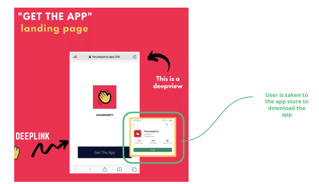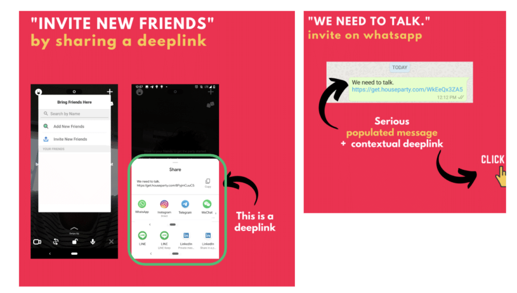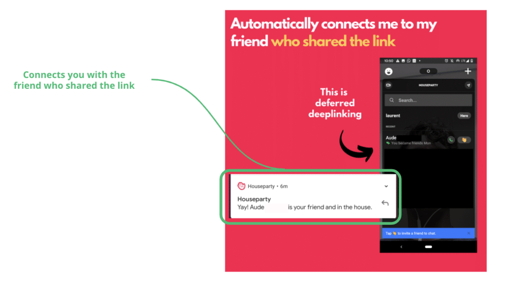 - Personalize the onboarding for people coming to your app from referrals and advocates. Making someone feel special when they come to your app improves conversion rates — in fact, Trip.com A/B tested this a while back and saw that mobile personalized onboarding almost doubles the signup rate on their welcome screen. If you know where someone came from, you can show the name of the friend who invited them after install, a special offer, or more. Houseparty has been growing a lot recently and their flow is genius — when you are added to a party, you join the party (your group of friends) right after install because the install link uses the meeting as a parameter that gets matched after install! See below: