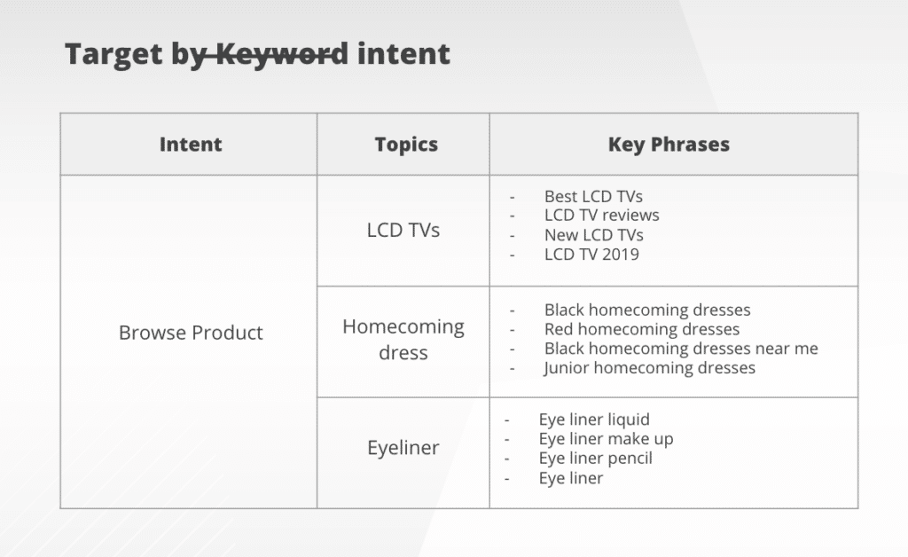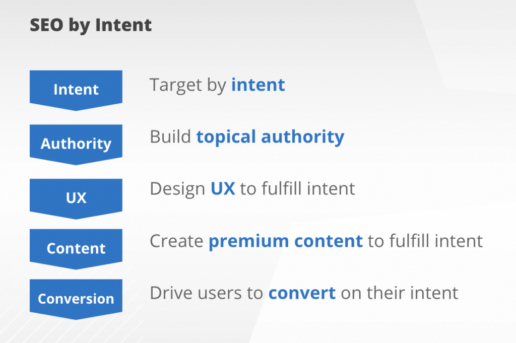 - Follow up on user and keyword intent — make sure that once you understand intent, you use intent down the conversion funnel. Below you can see a proposed methodology on how to think about intent from SEO all the way to product and design
