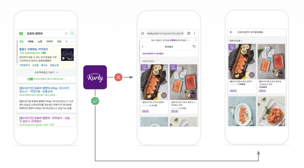 In addition to driving app installs from their own website, the Market Kurly team also leverages paid advertising through platforms such as Naver and Kakao — top-ranked platforms with the highest active users in Korea. With Branch’s Universal Ads solution, the team was able to improve the ad experience by seamlessly routing users with the app installed to the in-app product page while users without the app installed are taken to the mobile web: