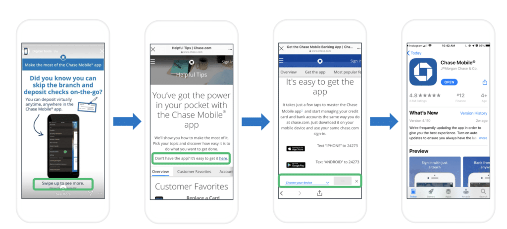 Similarly, Chase shows the many benefits of its app through Instagram stories that encourage people to download the mobile app to “Bank from anywhere,” highlighting common activities that can be done in the mobile app like depositing a check, transferring funds, or paying bills. Swiping up on the Instagram story leads users to the mobile web, then to the app store to download.