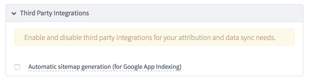 Last but not least: on the Link Settings page of the Branch Dashboard, scroll down to Third Party Integrations and check the box labeled Automatic sitemap generation (for Firebase App Indexing).