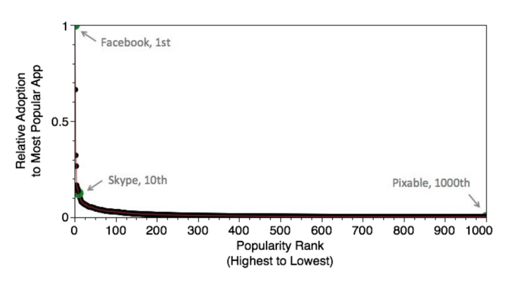 In his article “Mobile App Developers are Suffering”, Austin shares the driving force behind the power law’s expansion in the mobile app ecosystem: the simple notion that discovery favors the discovered. Specifically, Austin points to app store priorities and restrictions of space and memory on mobile devices as main reasons apps that aren’t currently among the most discovered are quickly disadvantaged. In a world in which downloading a new app is in direct competition with (for example) storing photos on phones, it can be difficult to drive even heavily incentivized mobile growth.