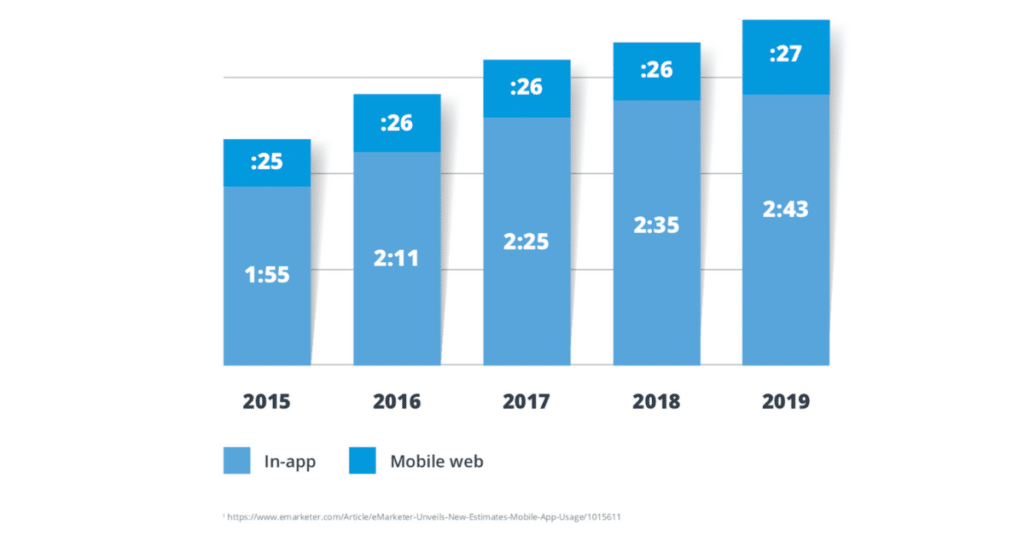 Data collected by eMarketer reveals U.S. adults spent an average of two hours and 35 minutes in-app in 2018 compared to just 26 minutes on the mobile web. The in-app share of U.S. mobile time continues to increase – from two hours and 25 minutes in 2017 and two hours and 11 minutes in 2016 – while time on mobile web remains stagnant.