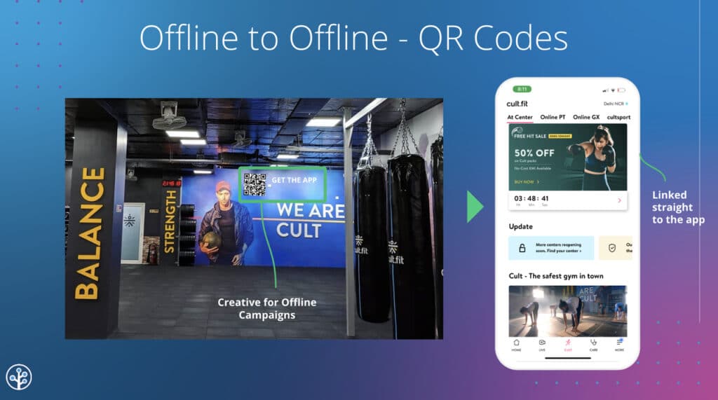 Outside of digital campaigns, cure.fit leverages Branch-powered QR codes to drive users to the app from offline environments where a quick scan enables users to transition from offline sources to content inside the app.