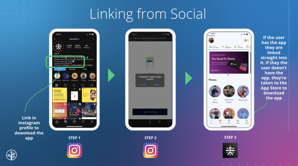 cure.fit leverages Branch’s linking infrastructure to guide its users into the app regardless of where they discover it.