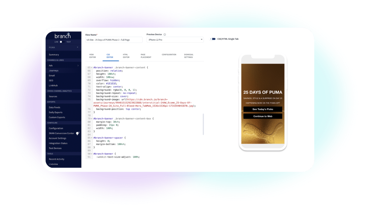 To maintain brand consistency and streamline implementation, PUMA repurposed existing creative assets from its website. Branch’s CSS editor made it simple to adapt these assets for the banner, eliminating the need for additional design work. This approach saved time while ensuring that the banner seamlessly fit within PUMA’s overall brand experience.