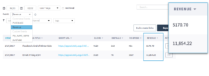WHERE: Select a custom event called “Revenue” in the Source Analytics or Marketing tabs in your dashboard. This will add a column to the table that shows you revenue from purchase events.